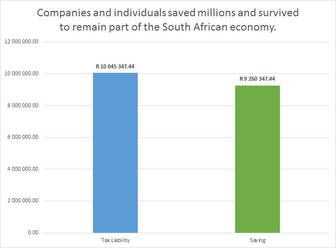 During 2014 I assisted clients/companies in making tax-savings to the value of R 9 260 347-44 and in the process hundreds of people working for these various clients/companies were saved from ending up being unemployed. My aim is to continue with this success rate in assisting clients/companies during 2015 in presenting comprehensive compromise offers to SARS in order to save money and jobs.